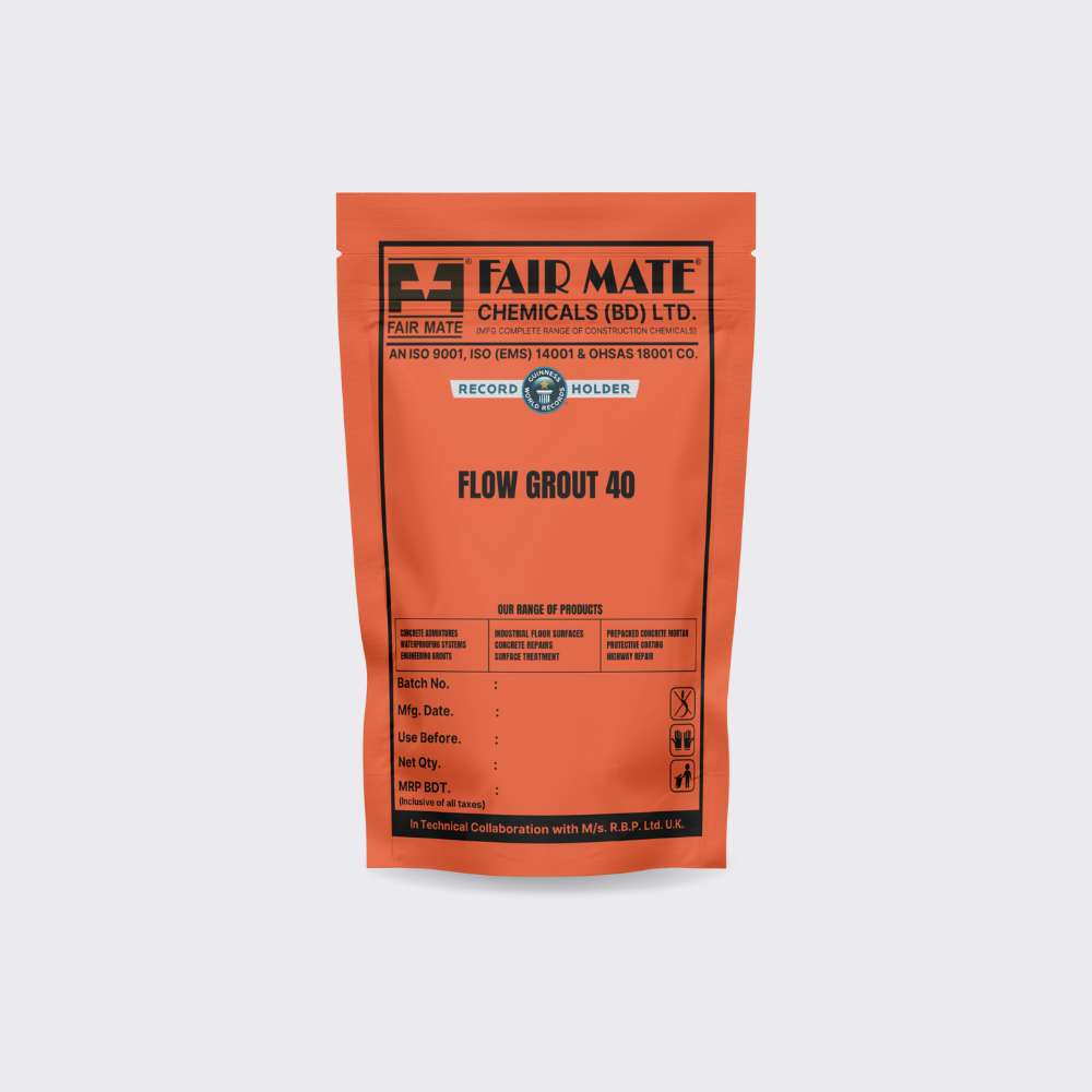 FLOWGROUT 40 is based on specially processed cements containing fillers and additives. FLOWGROUT 40 is supplied as ready to use grout requiring addition of precise quantity of water at site (4.75 Liter/25 Kg grout). This is suitable for gap widths between 10mm-50mm. For width less than 10mm FLOWGROUT EP resin grout can be used. For thickness in excess of 50mm. (say 75-100), cleaned washed 10mm aggregates can be incorporated at the rate of 50%-100% of the quantity of grout used. Water needs to be precisely measured for good early & final strength (is obtained due to very low water requirement). 25 Kg of FLOWGROUT 40 will require 4.75 Liter of water (W/P=0.19) for making flowing grout.